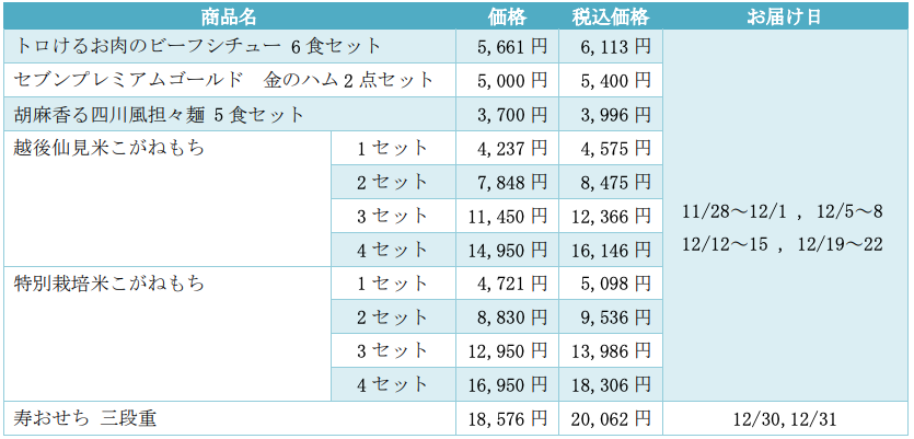 新年を彩るおせちは、セブン&アイグループ限定の2種類を用意した。産地を限定した特選素材を使用するなど、ひとつひとつの素材にこだわった伝統的な祝い肴やおせちの定番が勢ぞろいした本格的な品だ。また、贈り物にもぴったりな越後仙見米こがねもちや、デニーズ人気のビーフシチューや担々麺も用意している。