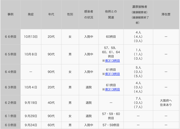 感染源に関する行動歴は60例目の濃厚接触者(60例目は10月6日に退院した後、10月13日にふらつき、息苦しさなどが見られ再入院)。濃厚接触者は同居者1人、同居以外の人3人だ。