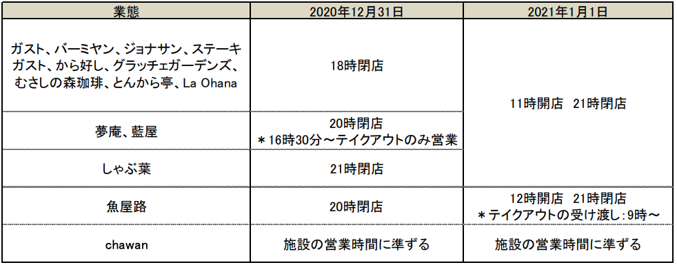 現在、新型コロナウイルスの影響で、人々のライフスタイルは大きく変化している。生活の中心がランチやディナータイムへ移行することに伴い、年末年始の過ごし方についても深夜時間帯のニーズは減少するものと考えている。ご自宅で過ごされる方が多いことから、宅配やテイクアウト需要は高くなると想定しており、一部業態では宅配やテイクアウトのみ時間を延長して営業する予定だ。