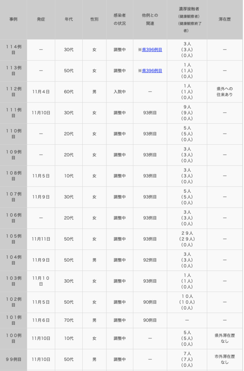 年代は50代の女性で居住地は長野市。症状及び経過は11月12日に県396例目の接触者として検体採取、検査の結果「陽性」と判明、入院調整中。感染源に関する行動歴は県396例目の接触者(同居以外の人)。濃厚接触者は同居の人1人。