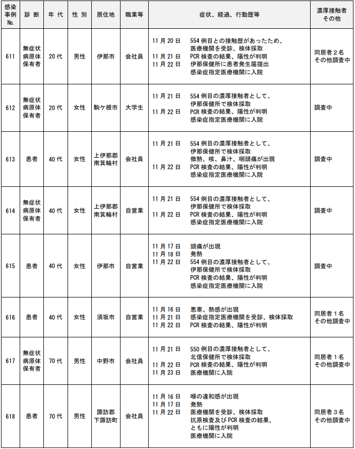 年代は50代の男性で居住地は伊那市、職業等は会社員。症状、経過、行動歴等は11月13日に 咽頭痛が出現。11月22日に601例目の濃厚接触者として伊那保健所で検体採取。11月23日PCR検査の結果、陽性が判明。11月24日に感染症指定医療機関に入院予定。濃厚接触者は調査中だ。623例目(患者)