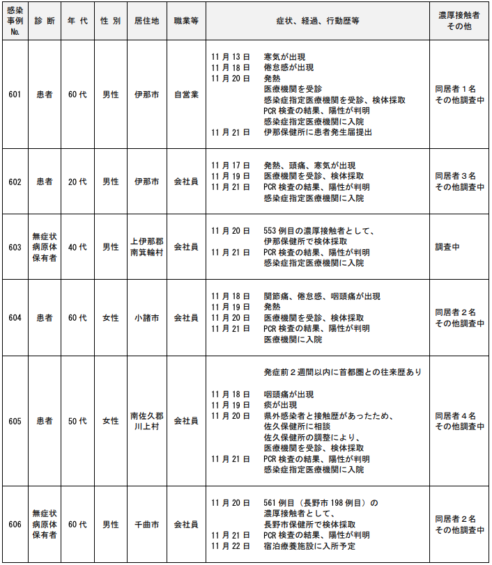 年代は20代の女性で居住地は上伊那郡南箕輪村、職業等は会社員。症状、経過、行動歴等は11月22日に603例目の濃厚接触者として伊那保健所で検体採取。鼻汁、咽頭痛が出現。11月23日にPCR検査の結果、陽性が判明。11月24日に感染症指定医療機関に入院予定。濃厚接触者は同居者1名、その他調査中。