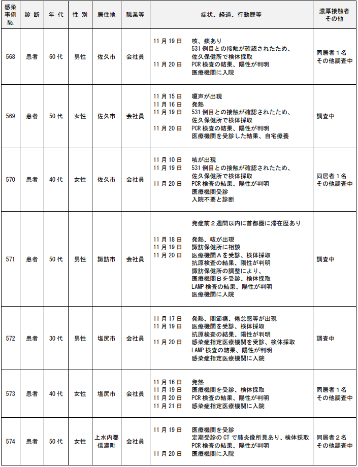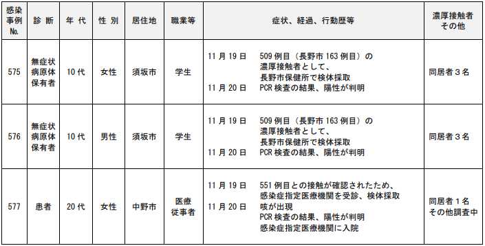 <11/21>長野県内において新型コロナウイルス感染症の感染者(患者等)が10例確認された(568~577例目)。県内感染者(患者493例、無症状病原体保有者84例)。