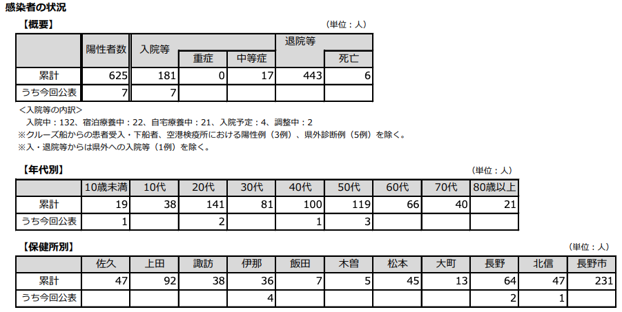 長野県内において、新型コロナウイルス感染症の感染者(患者等)が7例確認された(619~625例目)。県内感染者(患者525例、無症状病原体保有者100例)。