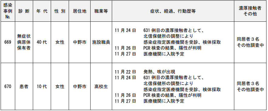 年代は40代の女性で居住地は下高井郡野沢温泉村、職業等は無職。症状、経過、行動歴等は11月24日に632例目の濃厚接触者として、北信保健所で検体採取。PCR検査の結果、陰性が判明。11月27日に発熱、北信保健所に相談。北信保健所の調整により感染症指定医療機関を受診、検体採取。11月29日にPCR検査の結果、陽性が判明。濃厚接触者は同居者2名、その他調査中だ。