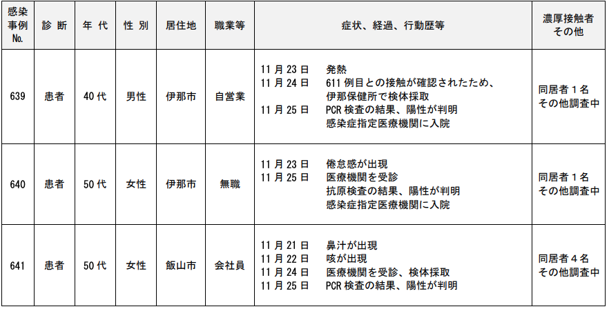 <11/26>長野県内において新型コロナウイルス感染症の陽性者(患者等)が3例確認(639~641例目)。県内陽性者(患者540例、無症状病原体保有者101例)。
