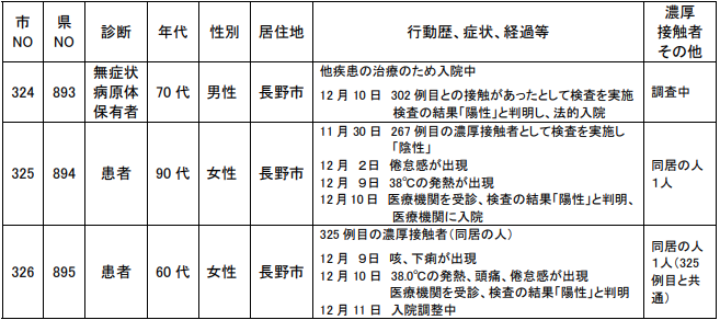 年代は30代の男性で居住地は長野市。症状及び経過は12月10日に39℃の発熱が出現。12月11日に医療機関を受診、検査の結果「陽性」と判明。12月12日に宿泊療養施設に入所した。濃厚接触者は同居の人3人、同居以外の人1人。