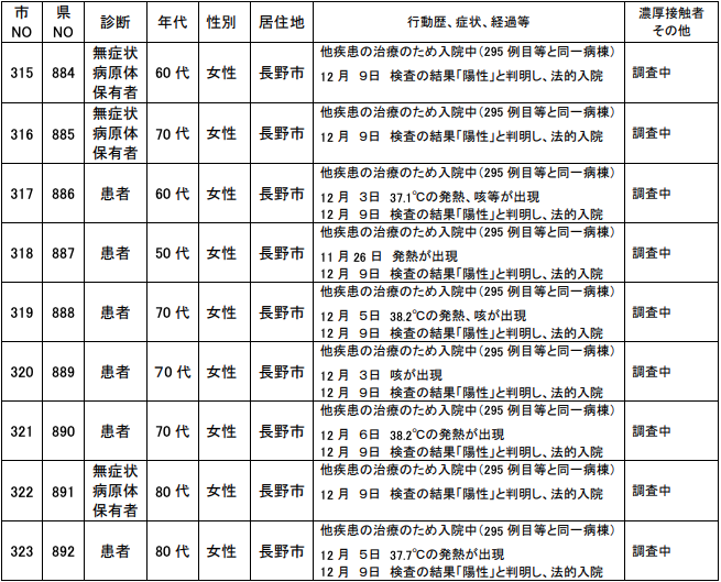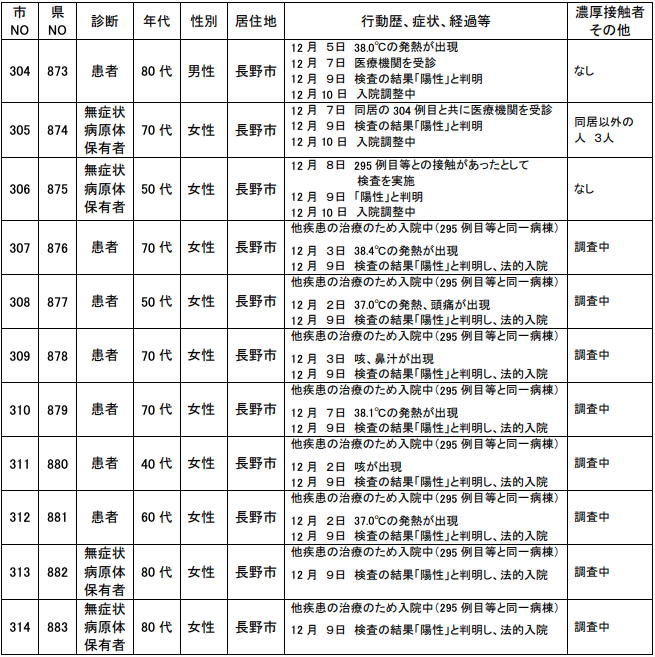 年代は20代の男性で居住地は長野市。症状及び経過は12月8日に咳、咽頭痛が出現。12月10日に医療機関を受診。12月11日に検査の結果「陽性」と判明。12月12日に宿泊療養施設に入所した。濃厚接触者は同居の人1人。