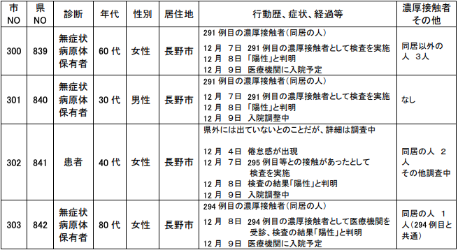 <12/9>長野市内において300~303例目の新型コロナウイルス感染者が確認