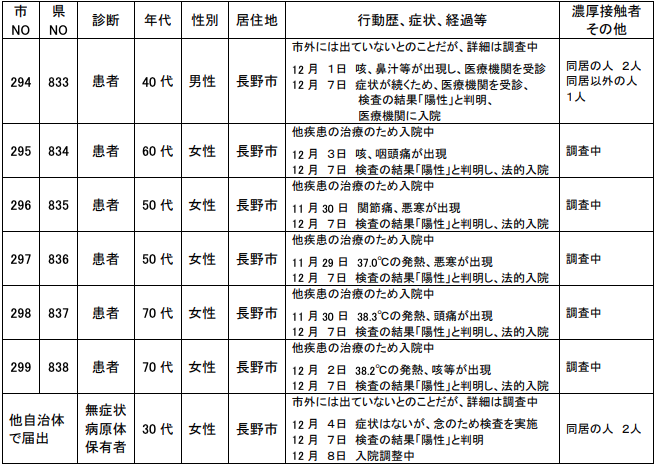 <12/8>長野市内において294~299例目等の新型コロナウイルス感染者が確認