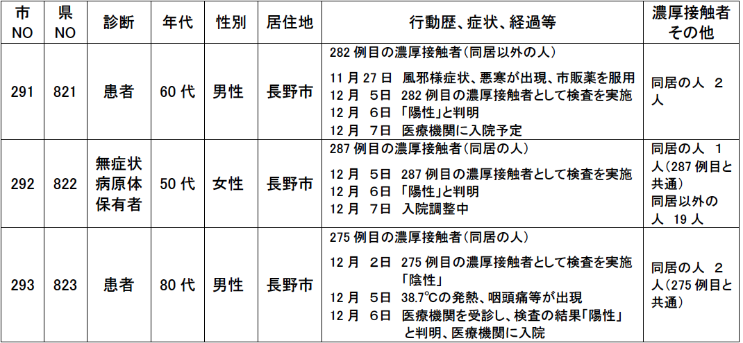 <12/7>長野市内において291~293例目の新型コロナウイルス感染者が確認