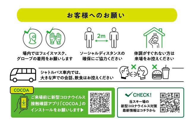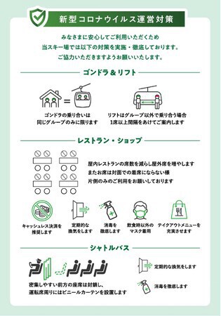 新型コロナウイルス感染症の収束の見通しが立たない中で迎える今シーズンは、「密」を避けるために接触を避けてお得なリフト券を購入、引換えできるオンライン販売( https://www.happo-one.jp/ticket/onlineticket/)及び自動発券機を導入するほか、ファミリーやスキー•スノーボード初心者でも気軽に楽しめるエリア「なきやまスノーランド」を新設してスキー場内の人の分散を図って運営する。