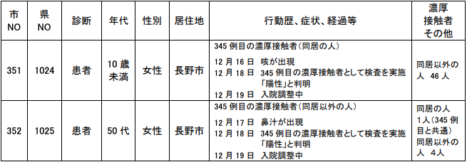 <12/19>長野市内において351、352例目の新型コロナウイルス感染者が確認