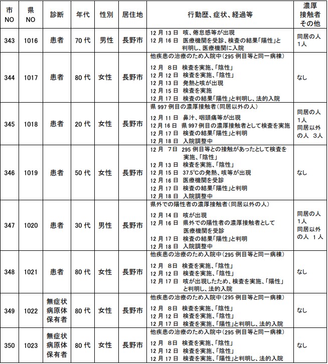 年代は50代の女性で居住地は長野市。症状及び経過は12月7日に295例目等との接触があったとして検査を実施し「陰性」。12月13日に検査を実施氏「陰性」。12月18日に咳、鼻汁等が出現。12月19日に医療機関を受診、検査の結果「陽性」と 判明。12月20日に入院調整中。濃厚接触者は同居の人1人。