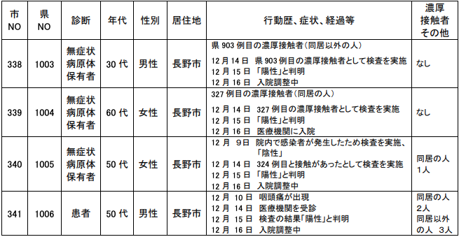 <12/16>長野市内において338~341例目の新型コロナウイルス感染者が確認
