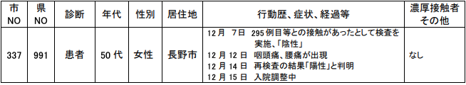 年代は70代の男性で居住地は長野市。症状及び経過は12月15日に336例目の濃厚接触者として検査を 実施氏「陰性」。12月17日に37.5℃の発熱が出現。12月18日に医療機関を受診。12月19日に検査の結果「陽性」と判明。12月20日に入院調整中。感染者に関する行動歴は336例目の濃厚接触者(同居の人)。濃厚接触者はなし。