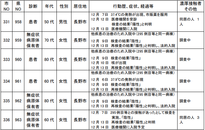<12/14>長野市内において331~336例目の新型コロナウイルス感染者が確認