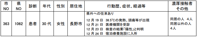 年代は40代の女性で居住地は長野市。症状及び経過は12月24日に363例目の濃厚接触者として検査を実施、「陽性」と判明。12月25日に入院調整中。感染者に関する行動歴は363例目の濃厚接触者(同居以外の人)。濃厚接触者は同居の人4人、同居以外の人1人。