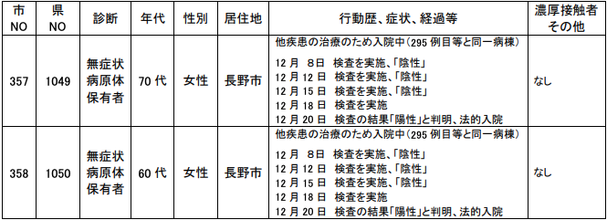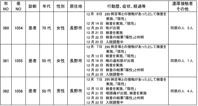 年代は60代の男性で居住地は長野市。症状及び経過は12月23日に359例目との接触があったとして、医療機関を受診。12月24日に検査の結果「陽性」と判明。12月25日に入院調整中。濃厚接触者は同居の人1人。