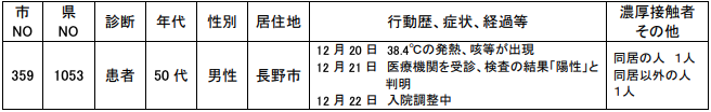 年代は30代の男性で居住地は長野市。症状及び経過は12月23日に喉の違和感が出現、359例目との接触があったとして、医療機関を受診。12月24日に検査の結果「陽性」と判明。12月25日に入院調整中。濃厚接触者は同居の人2人、同居以外の人1人。