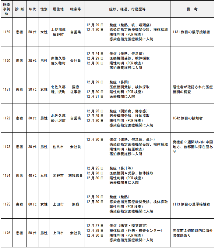年代は20代の男性で居住地は上田市、職業等は会社員。症状、経過、行動歴等は12月26日に 発症(微熱)。12月30日に検体採取(上田保健所)。12月31日に陽性判明(PCR検査)、宿泊療養施設に入所した。1151例目の濃厚接触者。