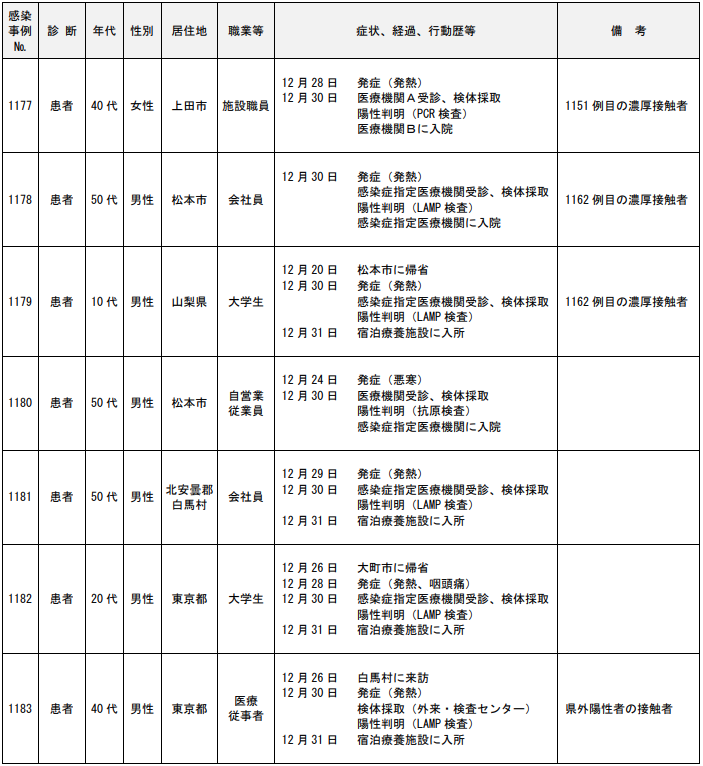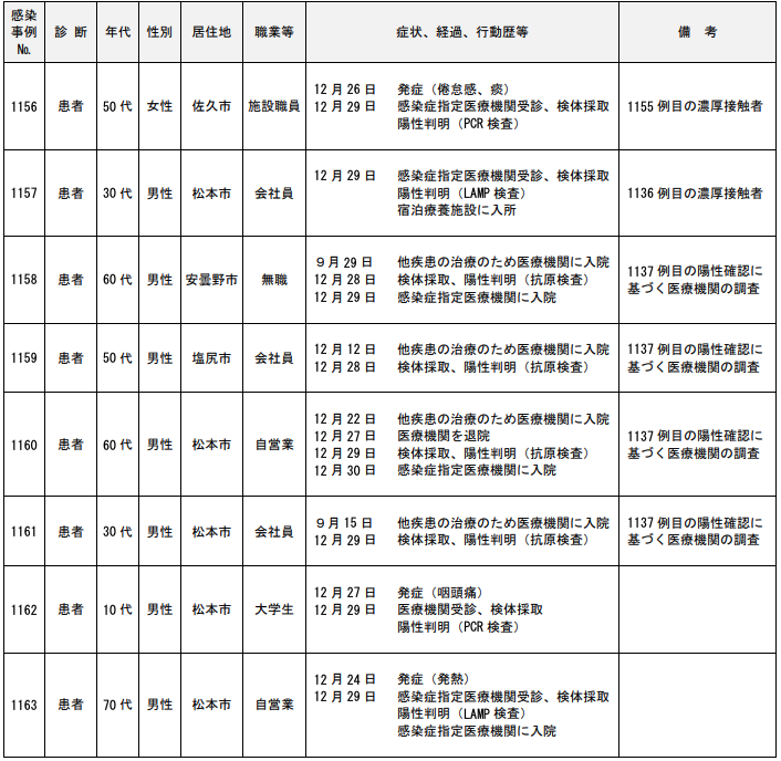年代は10代の男性で居住地は松本市、職業等は大学生。症状、経過、行動歴等は12月30日に 検体採取(外来•検査センター)。12月31日に陽性判明(PCR検査)、感染症指定医療機関に入院。発症(発熱)。1162例目の濃厚接触者。