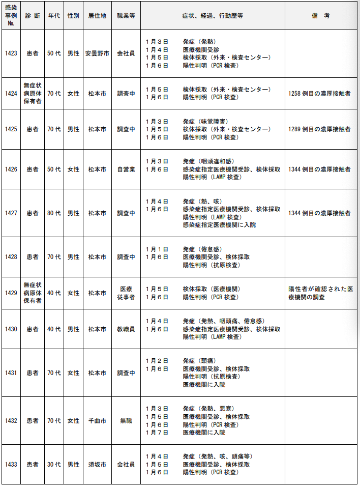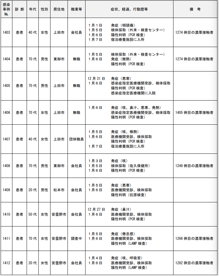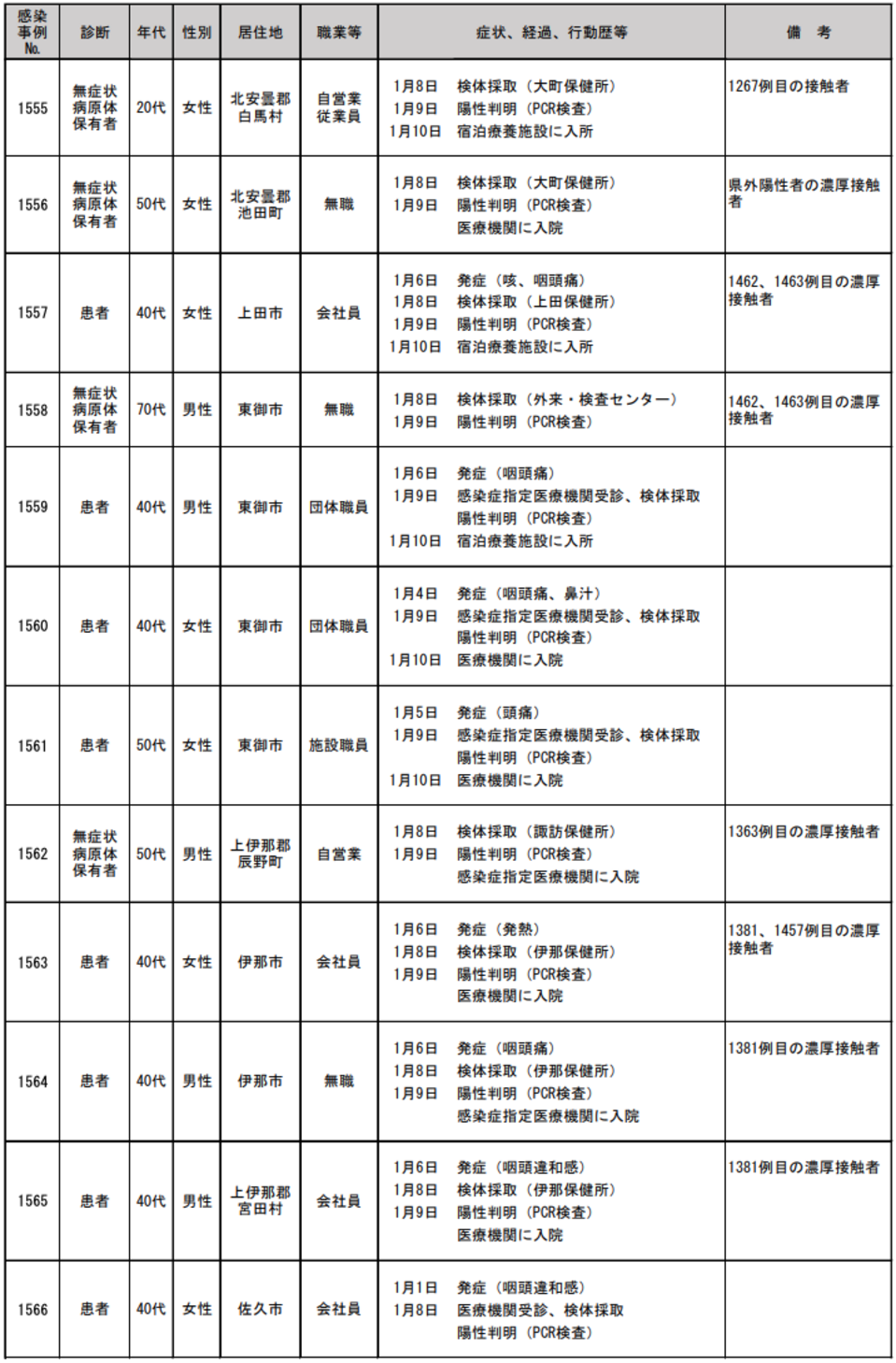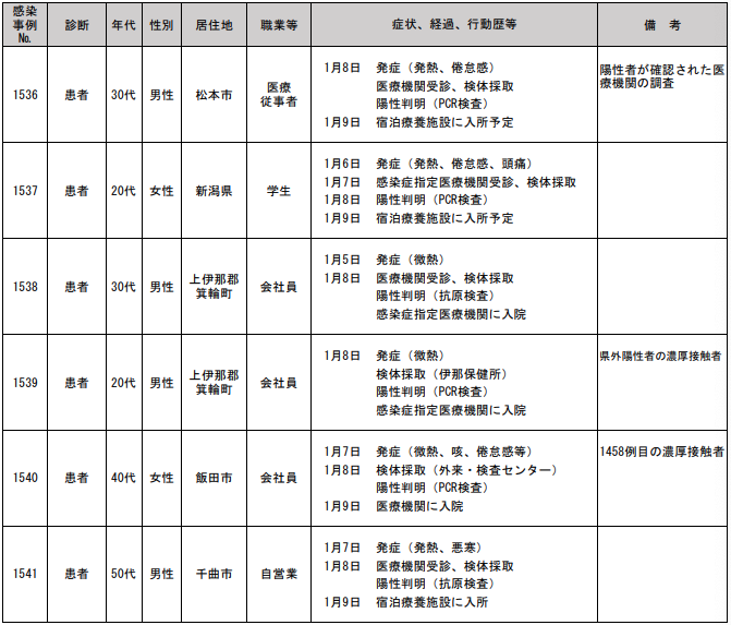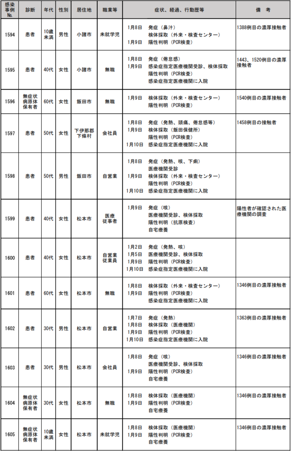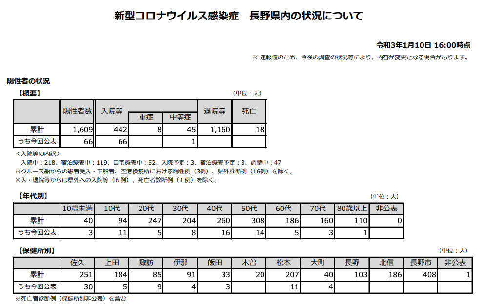 新型コロナウイルス感染症 長野県内の状況について(令和3年1月10日 16:00時点)