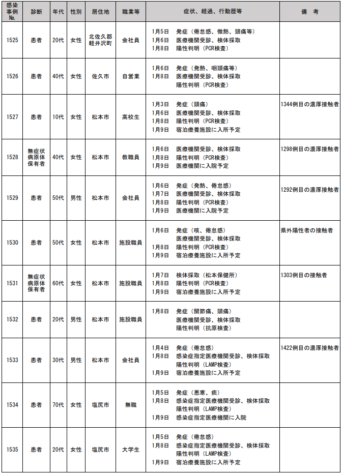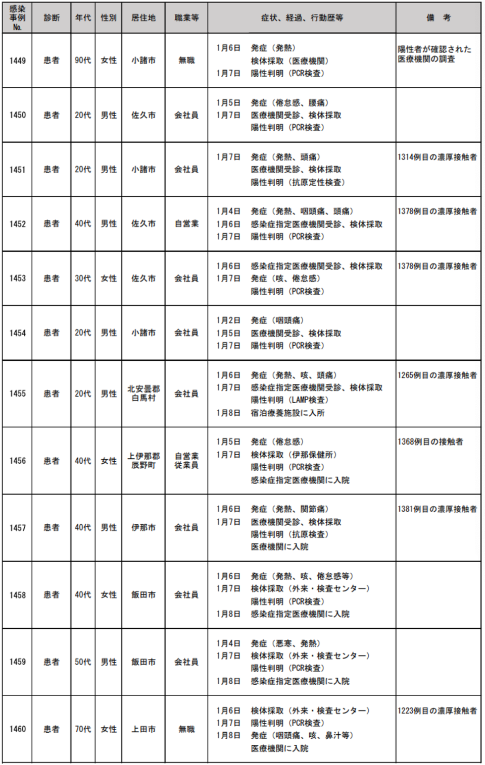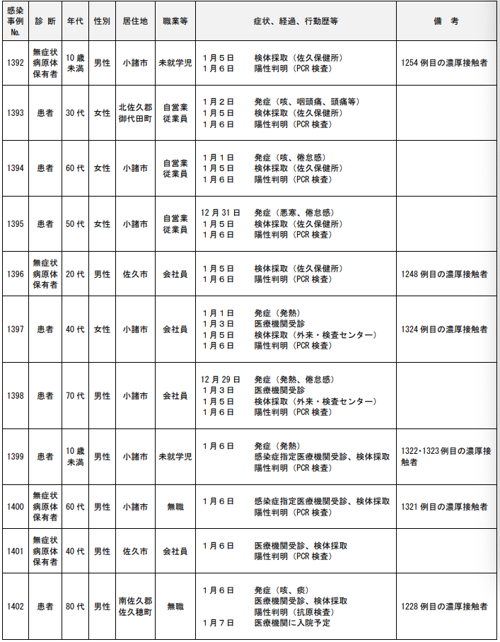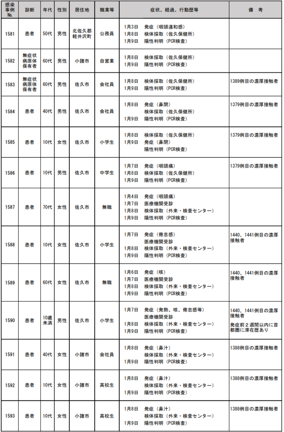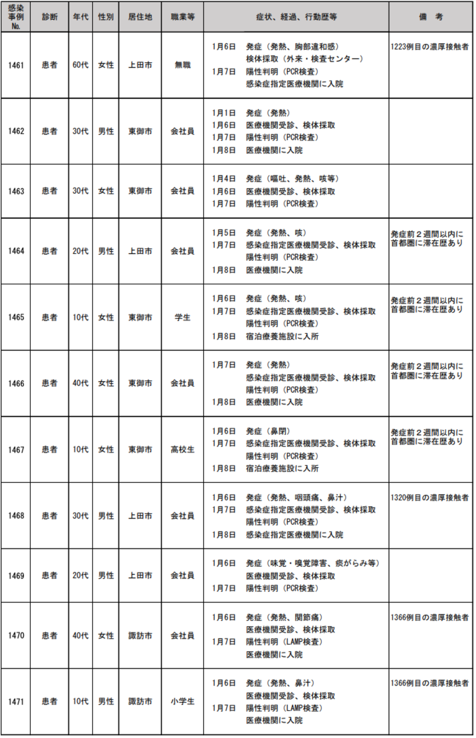新型コロナウイルス感染症 長野県内の状況について(令和3年1月10日 16:00時点)