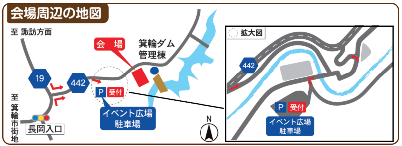 場所は上伊那郡箕輪町 信州もみじ湖発電所建設工事現場(県営箕輪ダム直下)※地図参照。運転前の発電所の内部を見学でき、水車に触れることができる。事前申込は不要。お車はイベント広場駐車場に駐車して、参加受付をお済ませて参加下さい(駐車場と見学会場間はシャトルバスに乗車いただき移動する)。