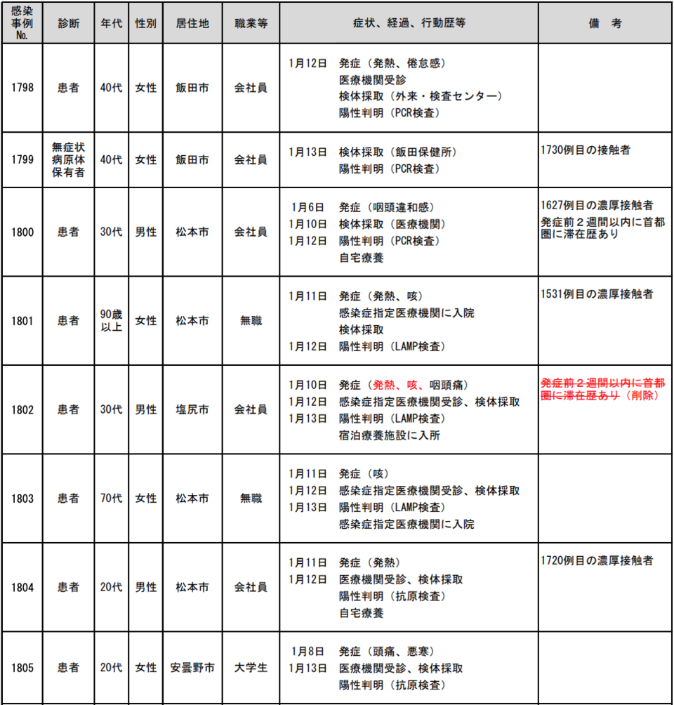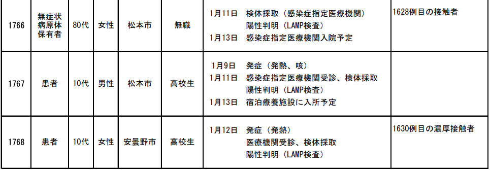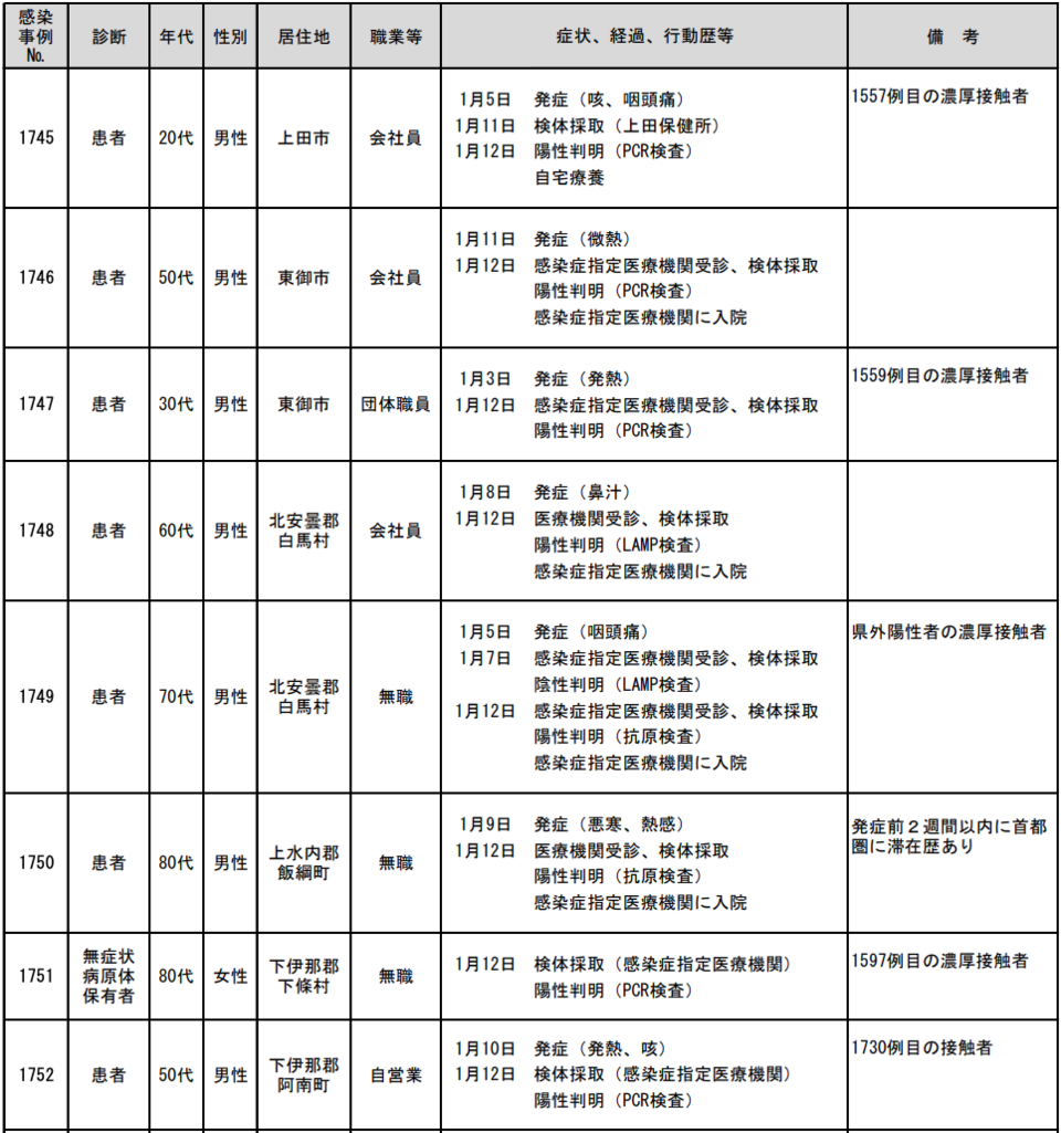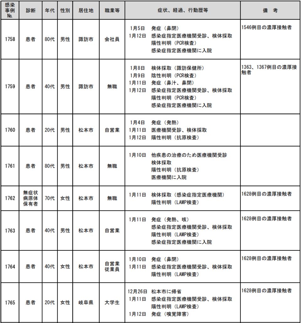 <1/13>長野県内において新型コロナウイルス感染症の陽性者(患者等)が35例確認(1734~1768例目)。県内陽性者(患者1457例、無症状病原体保有者311例)。