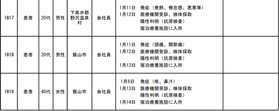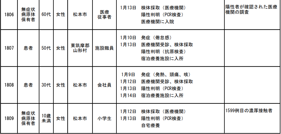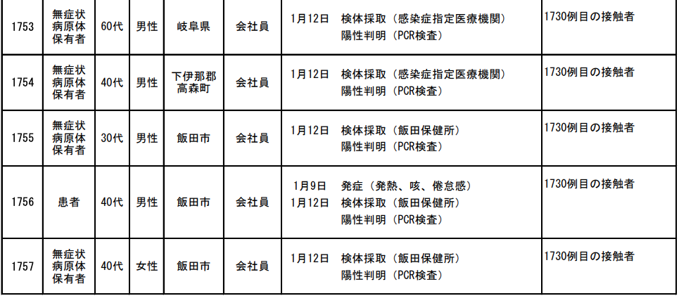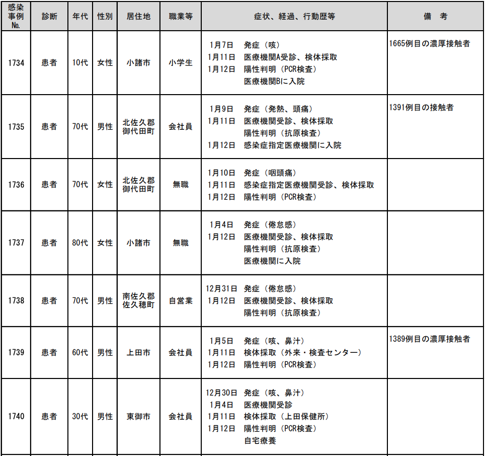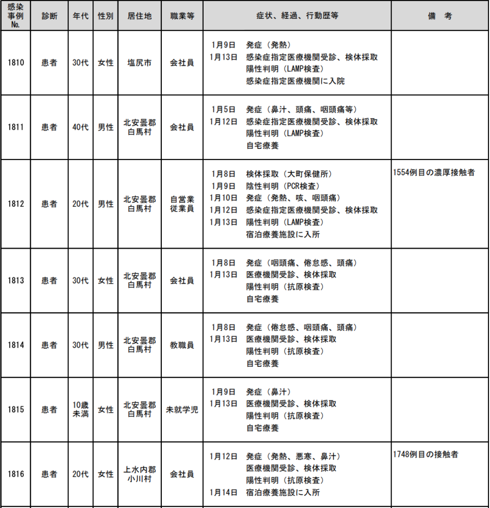 <1/13>長野県内において新型コロナウイルス感染症の陽性者(患者等)が35例確認(1734~1768例目)。県内陽性者(患者1457例、無症状病原体保有者311例)。