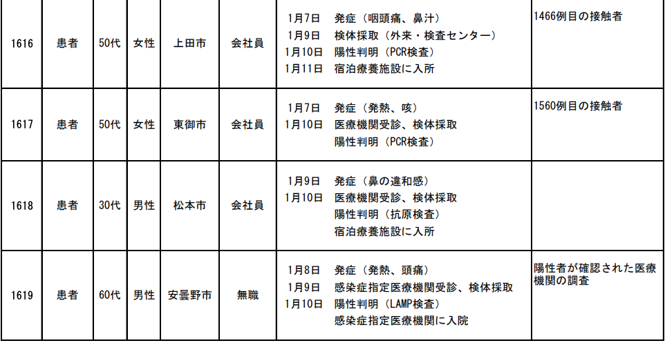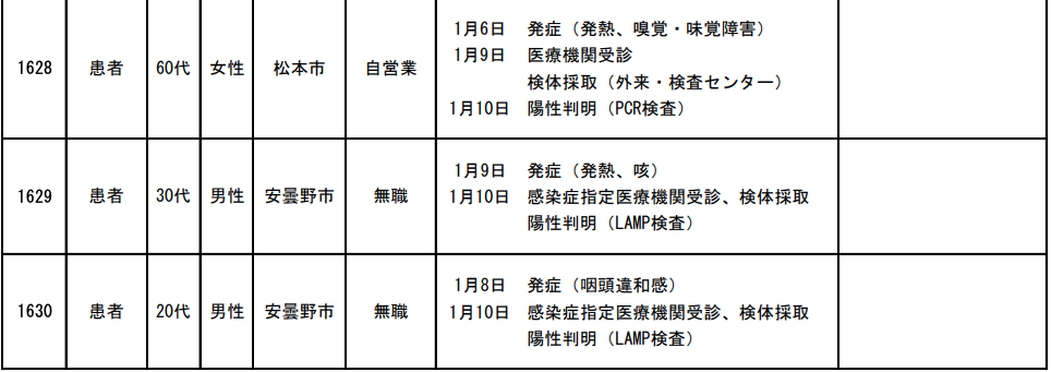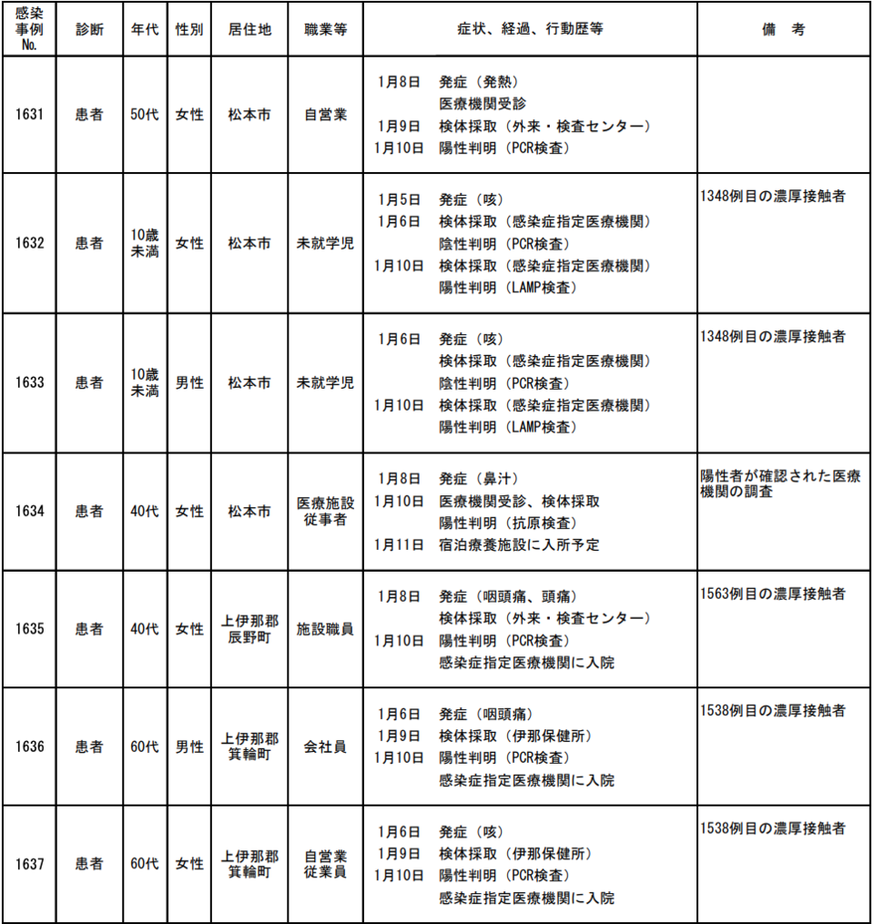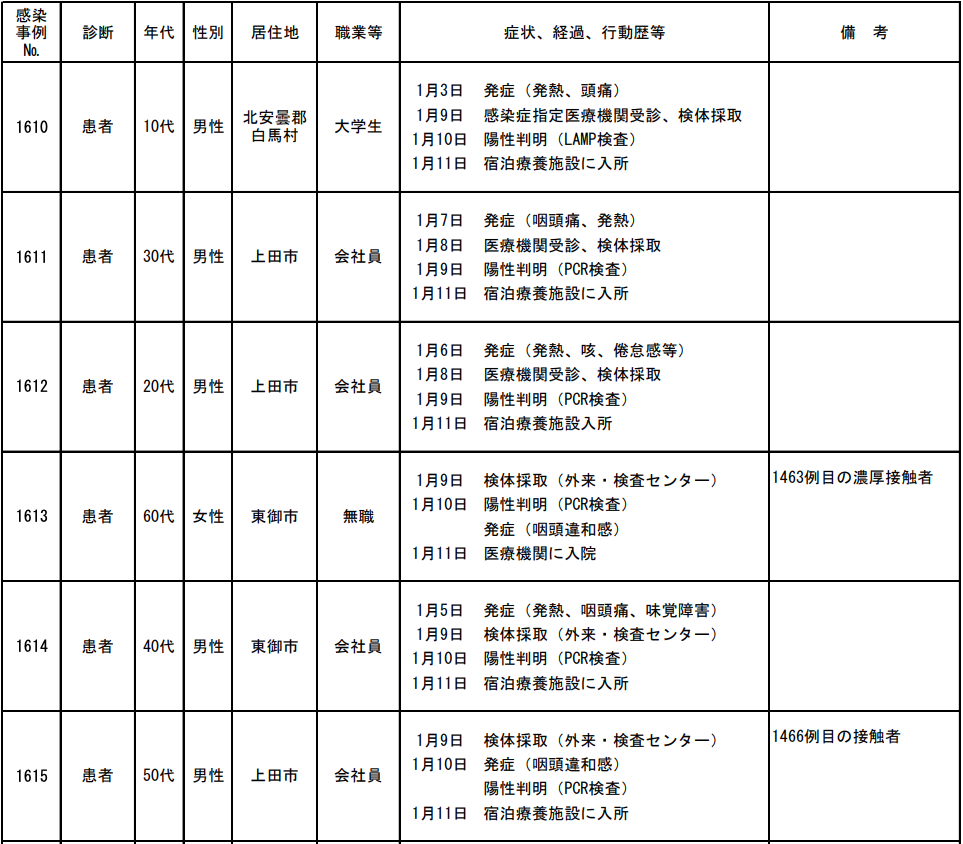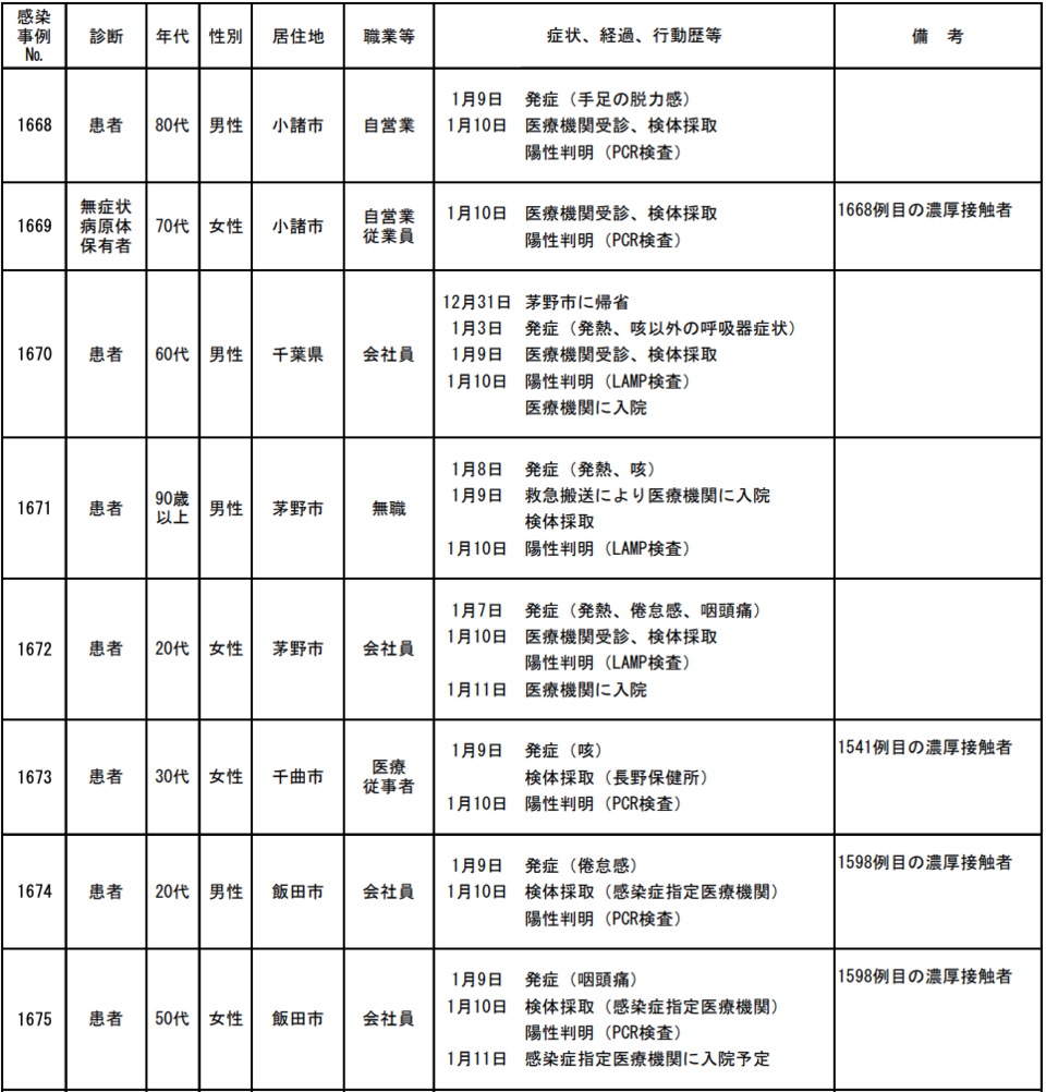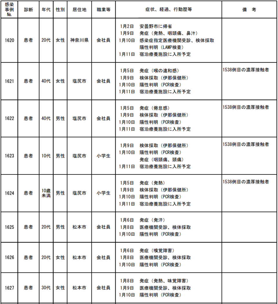 <1/11>長野県内において新型コロナウイルス感染症の陽性者(患者等)が73例確認(1610~1682例目)。県内陽性者(患者1392例、無症状病原体保有者290例)。