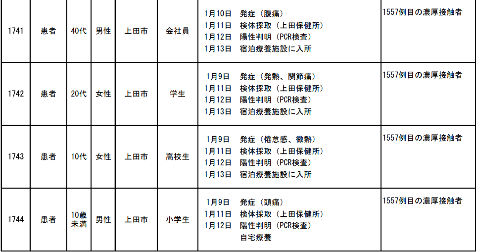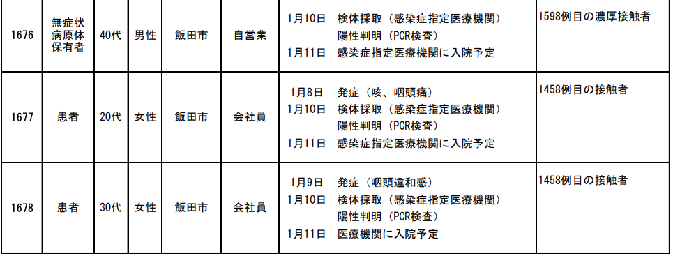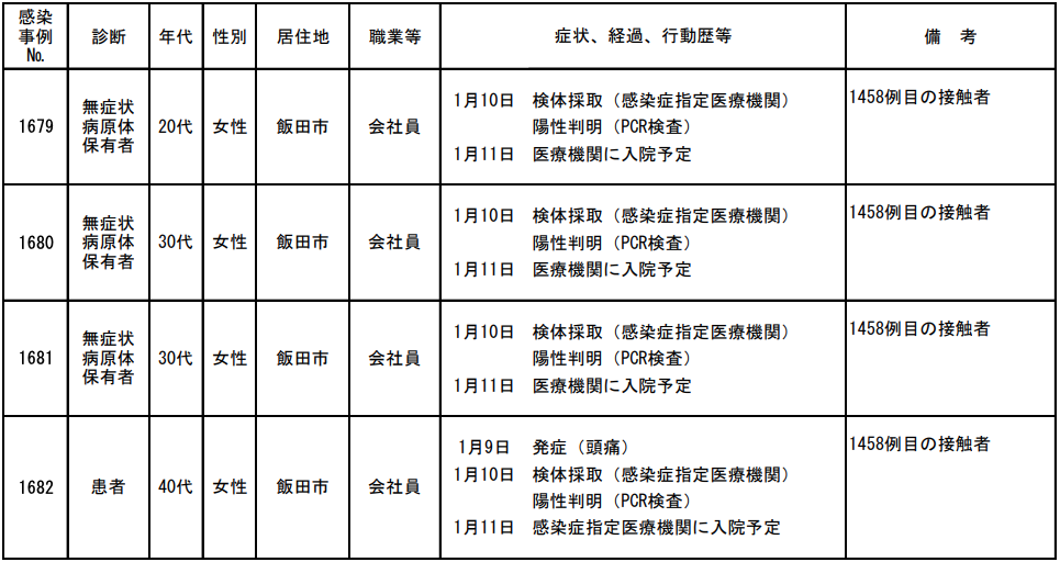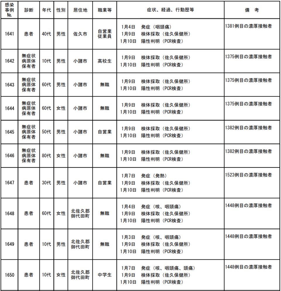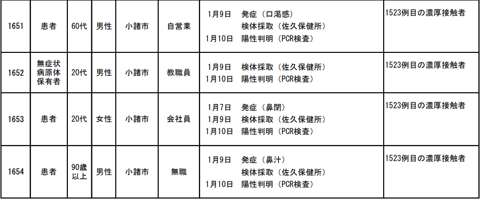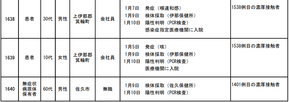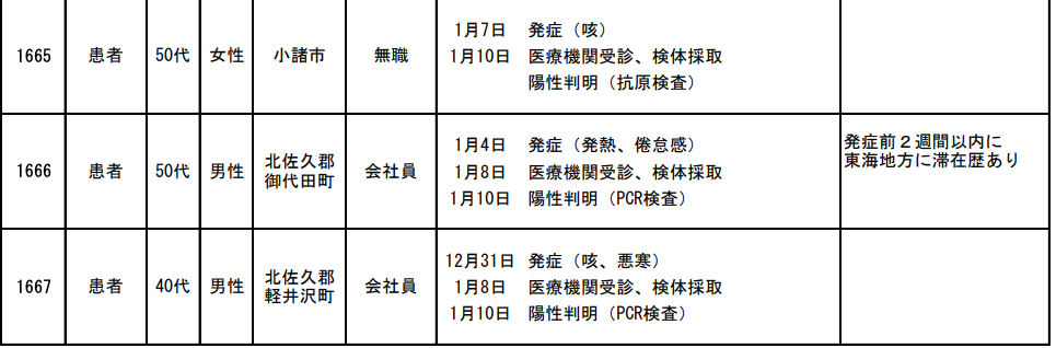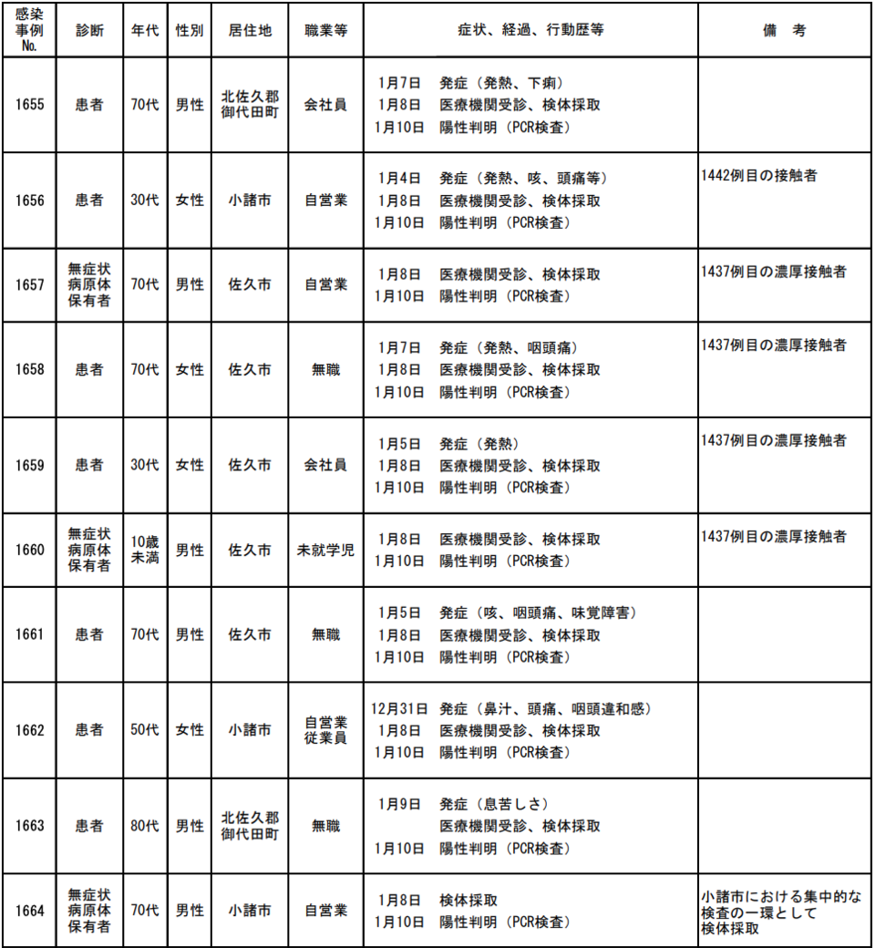 <1/11>長野県内において新型コロナウイルス感染症の陽性者(患者等)が73例確認(1610~1682例目)。県内陽性者(患者1392例、無症状病原体保有者290例)。