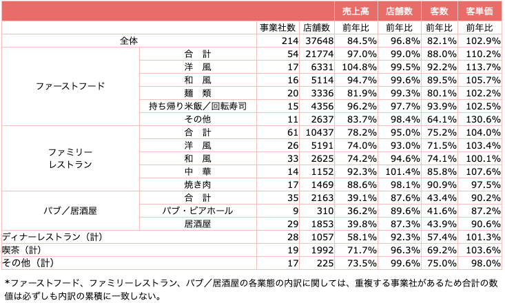 パブ•居酒屋業態では、飲酒業態は「コロナ第3波」の影響で酒類提供店舗に対する営業時間短縮の要請が全国的に広がり、夜の営業が売上げの大半を占めるパブ•居酒屋は特に大きな打撃を受けた。業態全体の売上げは39.1%、「パブ•ビアホール」は売上げ36.2%、「居酒屋」は39.8%だが、前年同月比20%台の店も出るほど厳しい状況が続いている。