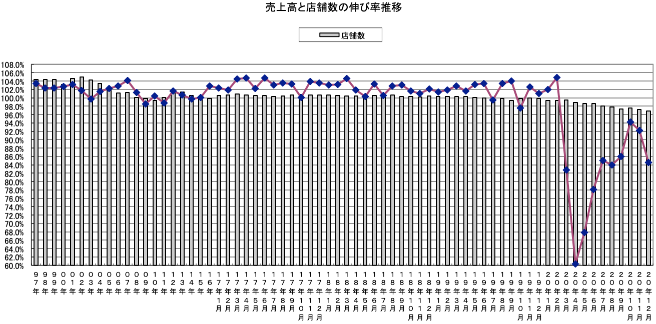 ディナーレストラン業態のディナーレストランは、これまで時短の要請と解除が繰り返される中、法人や大人数の宴会が全く期待できず、売上げは急減、前年同月比58.1%となった(11月の前年比は73.4%)。喫茶業態は年末には人の動きが更に鈍り、繁華街•ビジネス街はもとより郊外店舗でも集客が減り、売上げは71.7%となった。