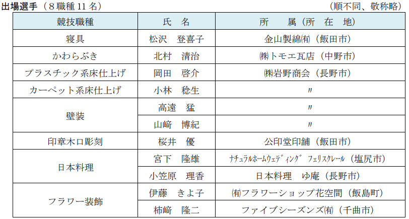 2月19日(金)から22日(月)に愛知県等で開催される「第31回技能グランプリ」に長野県から11 名の選手が出場し、技能の日本一を競う。