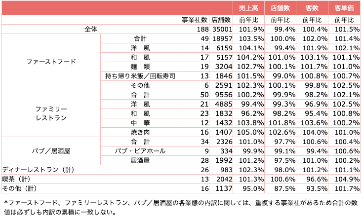 業態別概況ではファーストフード業態のFFは、洋風など巣ごもり需要でむしろ堅調な業態があったものの、店内飲食は客足減少、全体売上げは98.6%となった。 「洋風」はドライブスルー、テイクアウト、デリバリーが宣言下で伸び、まとめ買いによる客単価上昇も相まって、売上げは大幅増加、112.2%と唯一前年を上回った。