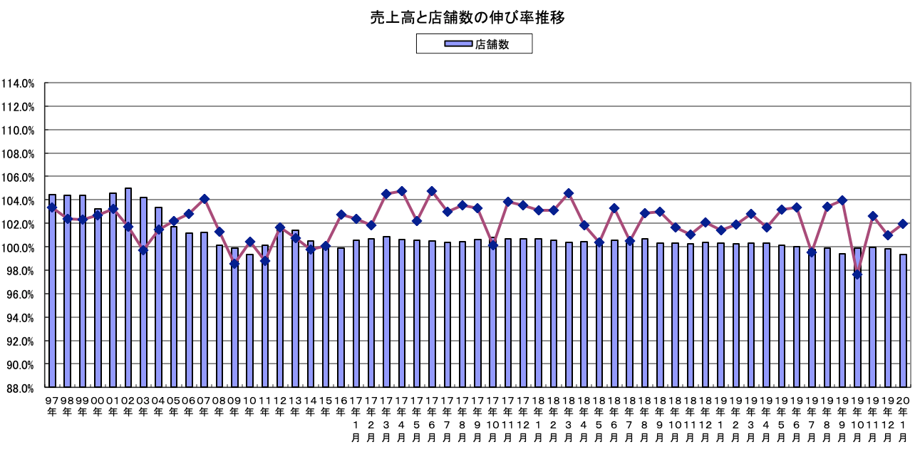 1月の全体概況は、新型コロナ感染拡大に伴う2度目の「緊急事態宣言」が発令され、東京•大阪など11都府県では、店内飲食の営業時間が20時までとなった。宣言直後から店内飲食の客足が激減、一部では休業する店舗も見られ、外食全体の売上げは前年同月比79.0%と、12月から更に落ち込んだ。しかも業態間の格差は広がり、特に宣言対象地域では、酒類提供が19時までに制限されたことで、飲酒業態は営業にならず、「パブ•居酒屋」は売上前年比25.1%と激減した。
