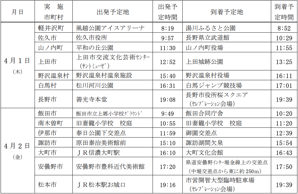 県内で実施される東京2020 オリンピック聖火リレーの出発予定時間と到着予定時間は次のとおりだ。また、長野県実行委員会が組織委員会に提出していた聖火ランナー候補者のうち、別紙のとおり聖火ランナーが選定されたので発表する。