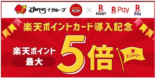 「楽天ポイントカード」が全国のすかいらーくグループ約2,700店舗で 順次利用可能に、「ガスト」ではサービス開始を記念して、「ガスト 楽天ポイントカード導入記念ポイント最大5倍キャンペーン」実施 |