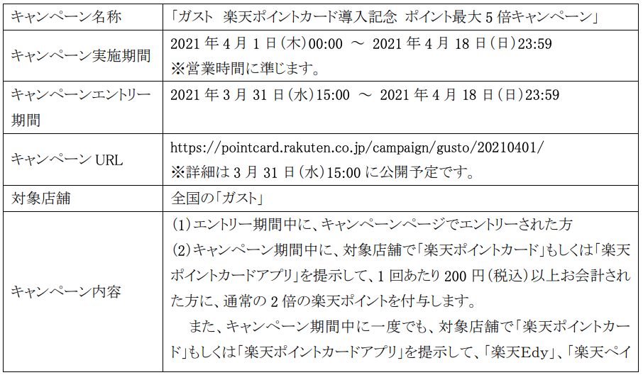 「ガスト」では本サービス開始を記念し、4月1日(木)から4月18日(日)まで、「ガスト楽天ポイントカード導入記念ポイント最大5倍キャンペーン」を実施する。期間中にキャンペーンページでエントリーのうえ、対象店舗にて会計時に「楽天ポイントカード」もしくは「楽天ポイントカードアプリ」を提示いただいた方に、通常の2倍の「楽天ポイント」を付与する。また「楽天ペイアプリ」または「楽天Edy」でお支払いいただいた方には、さらに3倍をプラスして5倍の「楽天ポイント」を付与する。