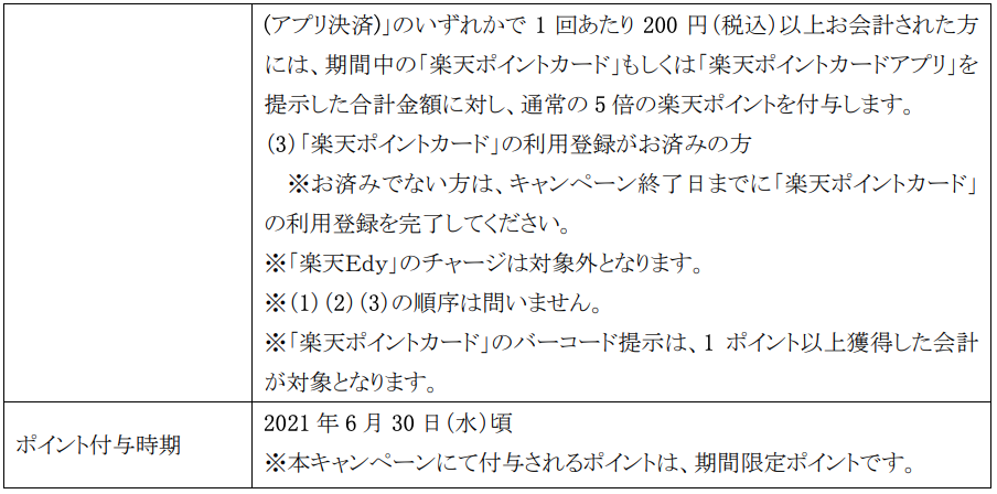 ・概要: 対象店舗にて会計時に「楽天ポイントカード」もしくは「楽天ポイントカードアプリ」を提示すると、「楽天ポイント」が付与される。また会計時に「楽天ポイント」を使用することができる。