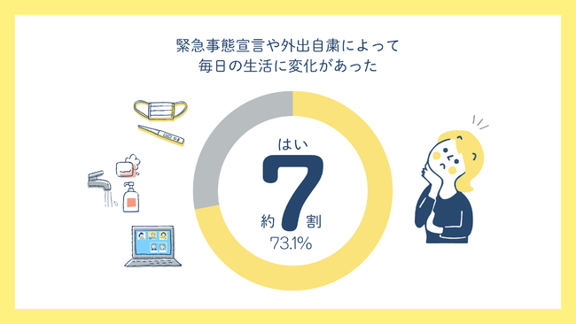 ・緊急事態宣言や外出自粛によって、毎日の生活に変化があった人が73.1%になった。変化の内容TOP3は「ストレスを感じやすくなった」「運動量が減った」「同じ姿勢でいることが増えた」