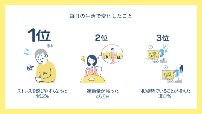 また、「どのような変化がありましたか?」という質問に、上位3位の回答は「ストレスを感じやすくなった(46.2%)」「運動量が減った(45.5%)」「同じ姿勢でいることが増えた(38.7%)」となった。新型コロナウイルス感染拡大対策のため、テレワークや不要不急の外出自粛を行っている人も多く、その影響が浮き彫りとなった。