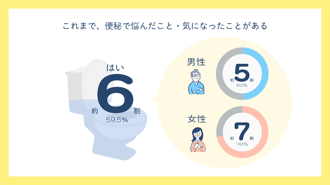 ◆これまで便秘で悩んだり、気になったことがある人は約6割。女性では約75%の人が便秘で悩んだり、気になったことがあると回答した。「あなたはこれまで、便秘で悩んだこと、気になったことがありますか?」という問いに対しては、「ある」と回答した人が59.5%となった。また、男女別で見ると、男性が44.5%に対して女性が74.5%と、女性の方が便秘で悩んでいたり、気になっていることが明らかになった。