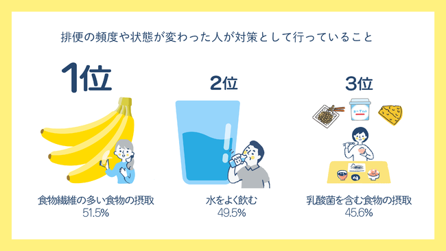 ・排便の頻度や状態が変わった人が対策として行っていることTOP3は、「食物繊維の多い食物の摂取」「水をよく飲む」「乳酸菌を含む食物の摂取」