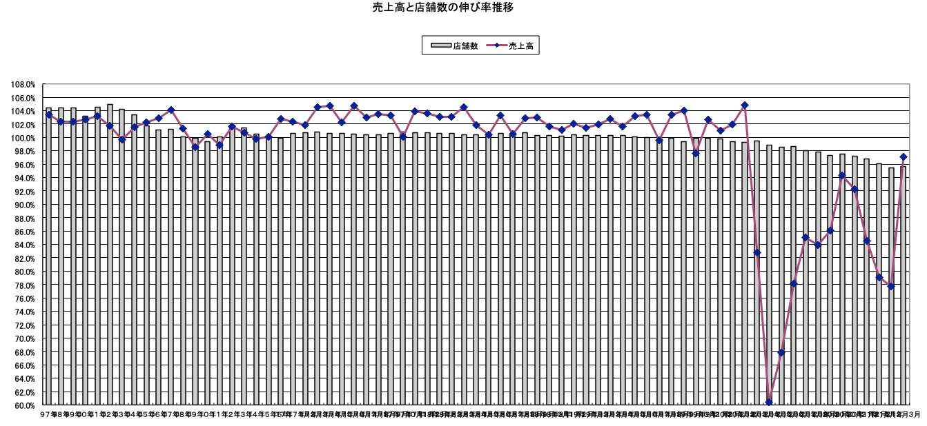 3月の全体概況は、緊急事態宣言が首都圏4都県で21日に解除され、市中への人出の回復がみられたものの、営業時間短縮要請は継続されたことから、全体売上げは対前年比97.1%、コロナ禍の影響がなかった前々年比では80.4%と、依然として厳しい状況となった。とりわけ酒類提供の時間を制限されたパブ・居酒屋業態への打撃は大きく、売上げは前年比60.3%、前々年比32.1%となった(以下カッコ内%は前々年比を表す)。