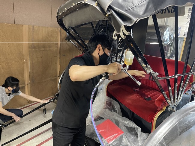 時代屋はこれまでも車夫は出勤時に必ず検温し体調に異常が無いかを確認、常時マスクを着用し、都度アルコール手指消毒や車体の消毒を行うなど、感染防止対策を徹底して来た。お客さまにも乗車前にアルコール手指消毒にご協力いただいていた。それらに加えて今般、車体を菌滅コーティングした人力車を使用することにより、さらに安心、安全にご乗車いただける。除菌剤と異なり、効果が長続きする特徴を持つ菌滅コーティングを、今後定期的に行う予定だ。