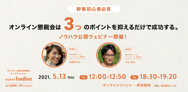 幹事初心者の方必見!オンライン懇親会は3つのポイントで 成功する!3000社にnonpi foodboxをお届けしてきたノンピが ”懇親会を成功させるノウハウ”共有ウェビナーを5月13日に開催 |