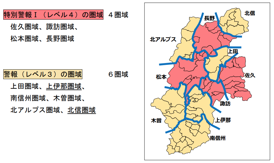 上伊那圏域及び北信圏域については、直近1週間の人口10万人当たりの新規陽性者数が10.0人を超え、感染拡大のリスクが高まっていると認められたことから、上伊那圏域については4月13 日に、北信圏域については4月14日に感染警戒レベルを4に引き上げ「新型コロナウイルス特別警報I」を発出した。